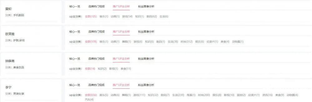头部UP主能够帮助品牌实现快速曝光,将品牌的核心信息直接宣传。腰部UP主和初级UP主能够帮助塑造品牌形象,让品牌辐射更多的用户。因此在达人的结构上主要选择小部分的头部UP主和大部分的其他属性UP主,来达到曝光和辐射的双重效果。