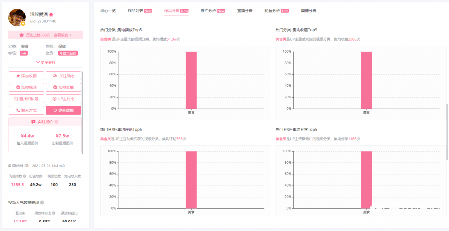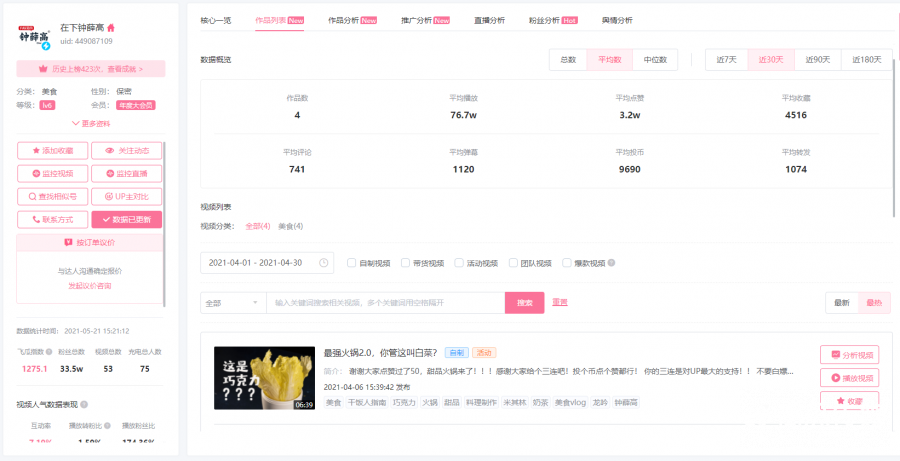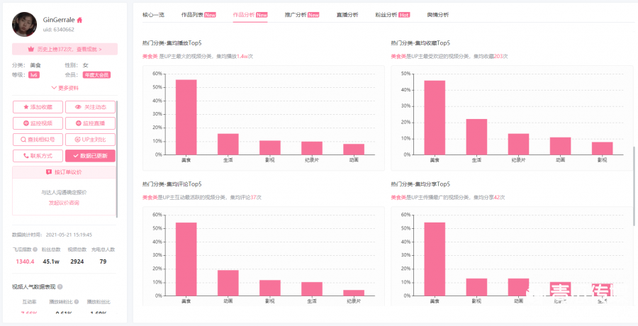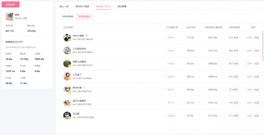 但一个UP主因其多元的视频内容可能使账号带上多个内容标签,品牌方可以从“作品分析”中查看UP主账号的垂直性。例如以下两位UP主,同样属于美食类目,但内容标签差异明显。