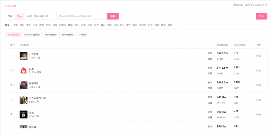 前文说过,B站因多样且垂直的兴趣区成为品牌不可忽视的营销阵地,因此品牌方要根据不同的产品属性,选择投放的兴趣爱好圈层。例如“中国风”爱好圈子适合被汉服品牌、国风美妆品牌作为垂直领域投放,也可作为国漫和国产仙侠手游的泛区投放领域。在行业标签榜中,品牌方通过了解每种兴趣圈的标签热度和相关视频数量,为品牌选择投放领域做选择参考。