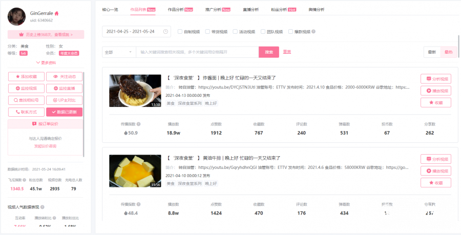 最后是鉴别UP主创作能力。内容创造力是影响触达效果的根本,通过作品分析,可以了解UP主的作品主要为自制视频、带货视频、活动视频还是团队视频。例如上述例子中的UP主“GinGerrale”,其作品皆转自油管,无自制视频,这样的UP主是较难拥有商业合作空间的。