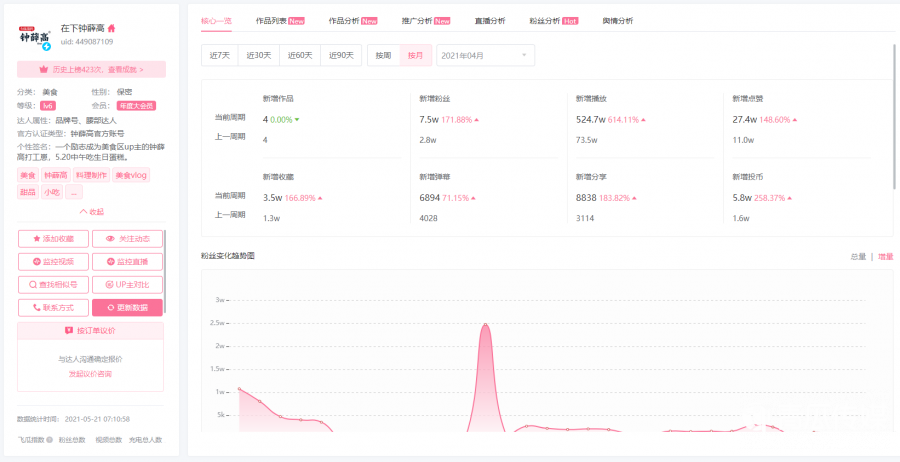5月20日登上日榜排名第一的钟薛高品牌号“在下钟薛高”,就多次因为古怪的创意或结合宅文化热点的制糕内容和幽默风趣的表达获得B站用户喜欢。根据飞瓜数据显示,4月“在下钟薛高”账号新增粉丝7.5万,新增播放524.7万,新增投币5.8万。