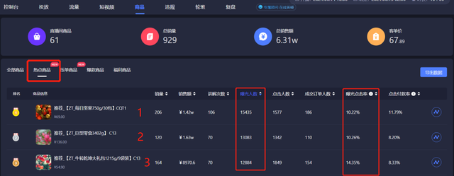 尽量选择高曝光高点击的产品,限量的方式才能最大程度刺激到用户,【热点商品】支持对直播间商品的曝光点击率排列,例如,商品3的曝光点击率是最高的,因此可以选择商品3,根据直播间人气,限量上架。